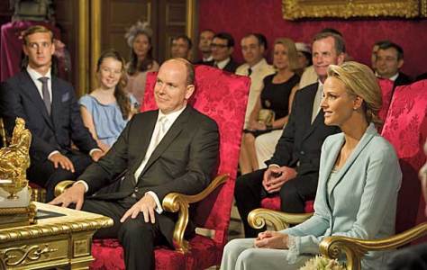 At 5pm in the Throne Room at the Palais Princier de Monaco Miss Charlene Wittstock and H.S.H. Prince Albert II of Monaco were married in a lovely intimate civil ceremony attended only by their immediate families and select friends. Not too long after the service began Miss Wittstock said, “Oui” to her fiancé. And, from that moment (besides signing the registrar book thingy) the former Olympian swimmer became known as Her Serene Highness Princess Charlene of Monaco. 🙂