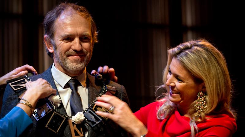 On November 28, 2011, H.R.H. Princess Maxima of the Netherlands attended the 2011 Prince Berhard Cultuurfonds Award in Amsterdam. Held at the Muziekgebouw (Music Building) this year’s prestigious award was given to filmmaker and photographer, Anton Corbijn. According to, NOS, Mr. Corbjin won the prize: