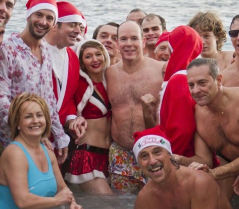 On Larvotto Beach this cold Sunday morning, December 18, 2011, His Serene Highness Prince Albert II of Monaco, along with 200 brave men and women, participated in the traditional Christmas Bath. Before jumping into the freezing Mediterranean sea the gutsy participates pumped themselves up by listening to traditional Tahitian Pahus (drums) and chanting. Soon, the Sovereign Prince joined the excited participants on the beach where he mingled with them as well as posed for photos. Then they were off… throwing themselves into the 14* water and had one hellva time!