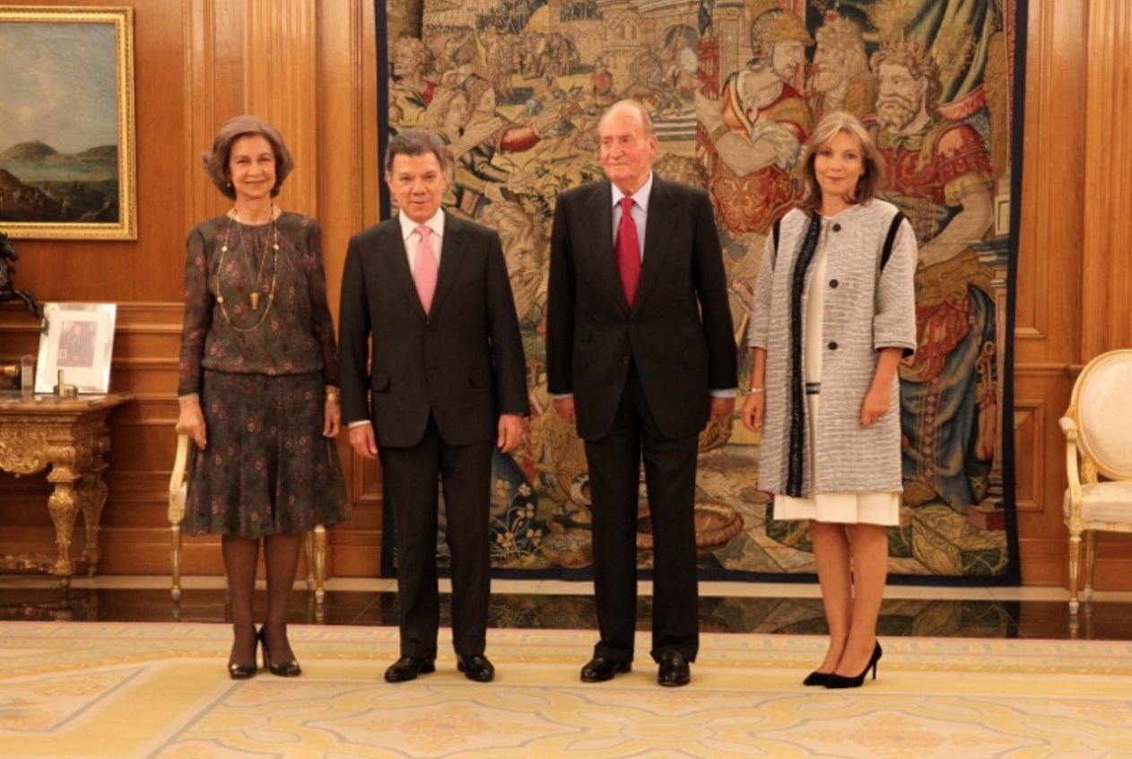 On Wednesday, January 22, 2014, Their Majesties King Juan Carlos I and Queen Sofia of Spain held an audience with the President of Colombia, Mr. Juan Manuel Santos Calderón, and his wife, First Lady María Clemencia Rodríguez Múnera, at Palacio de la Zarzuela in Madrid.