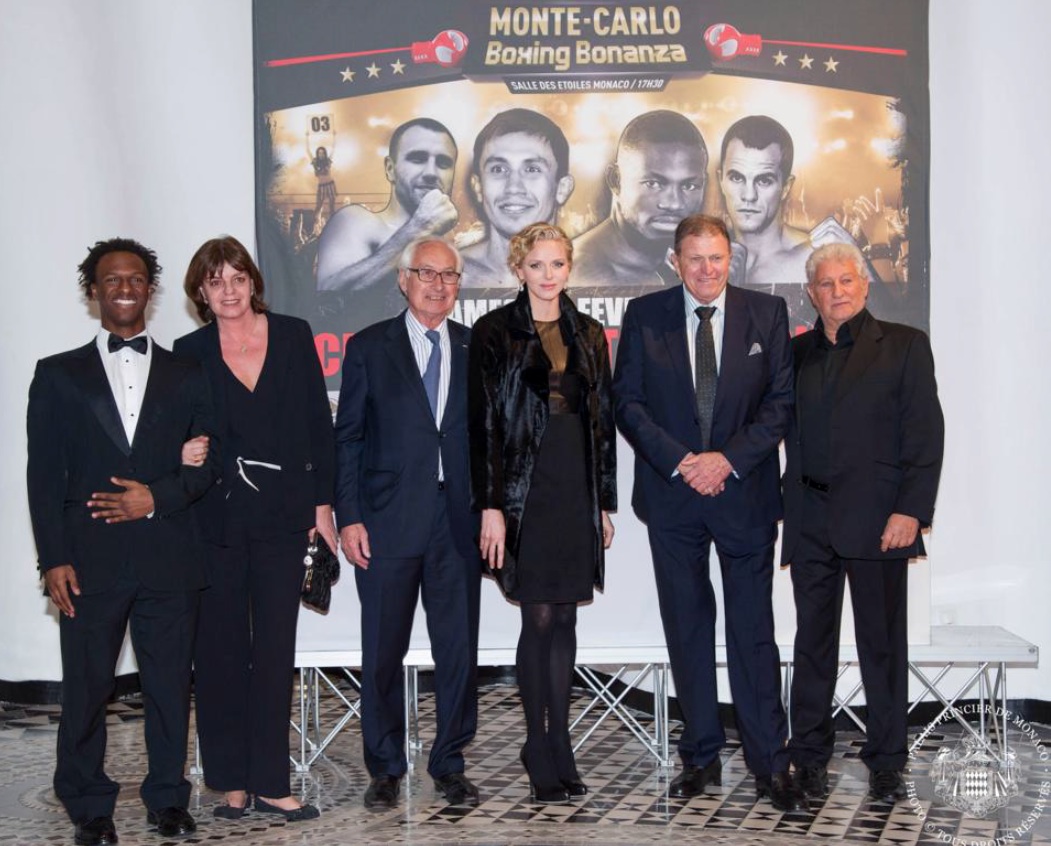 On Saturday, February 1, 2014, Her Serene Highness Princess Charlene of Monaco accompanied by her father, Mr. Michael Wittstock, attended the Monte-Carlo Boxing Bonanza in the Salle des Étoiles at the Sporting d’été.