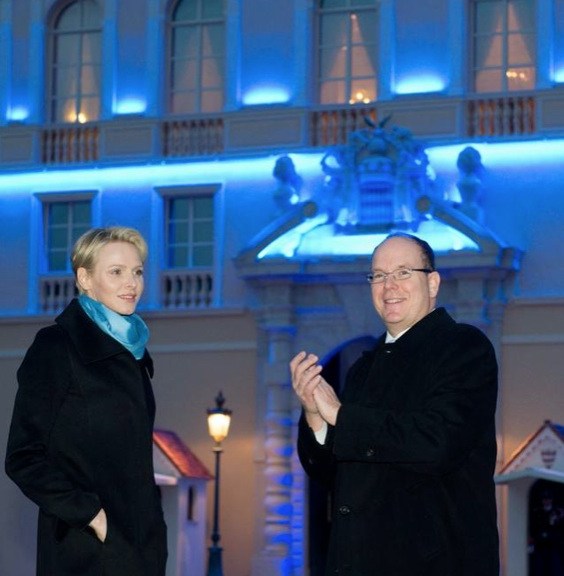 On the evening of April 2, 2014, Their Serene Highnesses Prince Albert II and Princess Charlene of Monaco attended the launch of Push the Button, Palace in Blue at the Palais Princier. Today’s event was held on the occasion of World Autism Awareness Day. The lovely princess is also the Honorary President of Monaco Against Autism (MONAA).