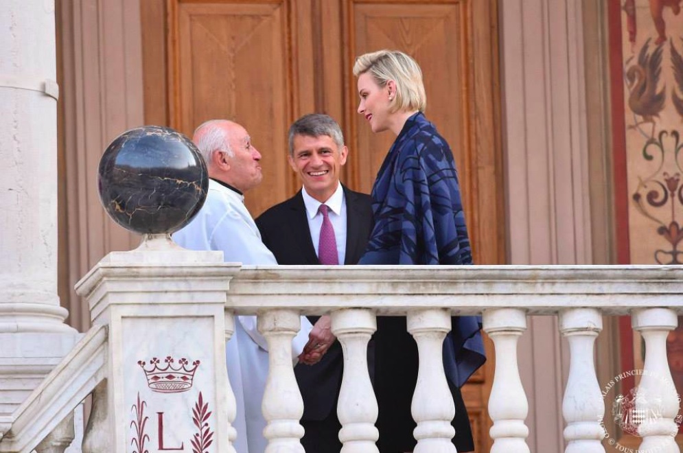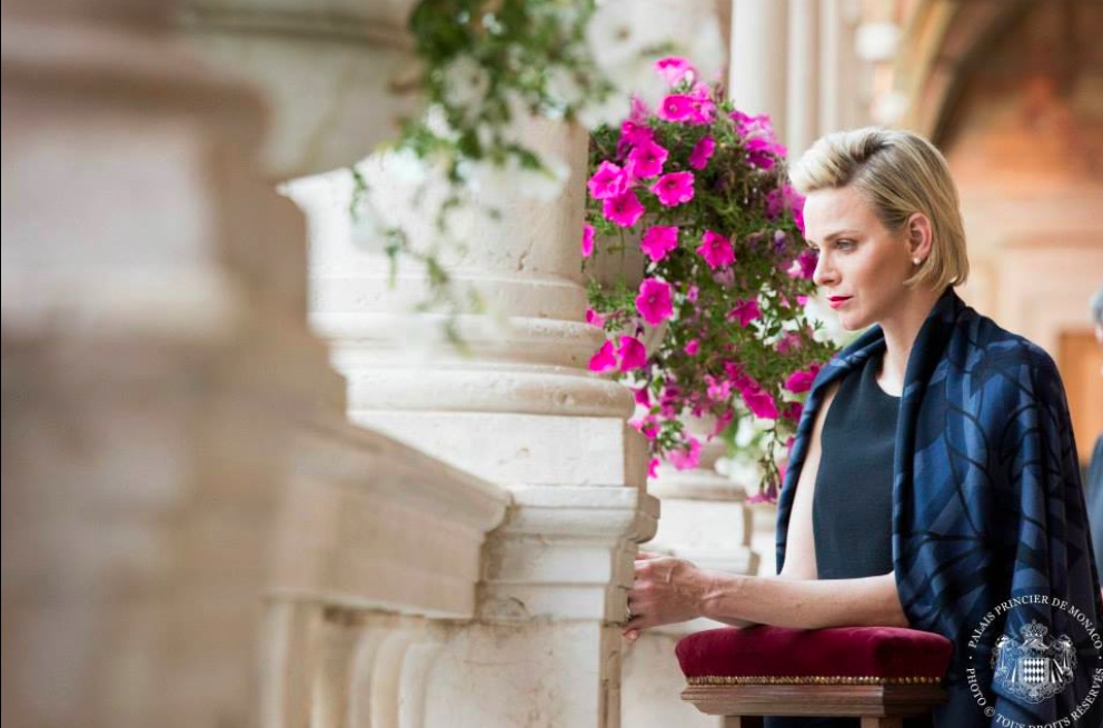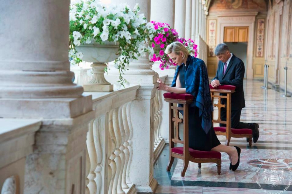 On Thursday, June 4, 2015, Her Serene Highness Princess Charlene of Monaco witnessed the procession of the Pénitents de la Vénérable Archiconfrérie de la Miséricorde (Venerable Brotherhood of Mercy) into the Palais Princier courtyard after Mass at the Cathédrale de Monaco celebrating Corpus Domini Fête Dieu: Solemnity of the Blessed Sacrament.