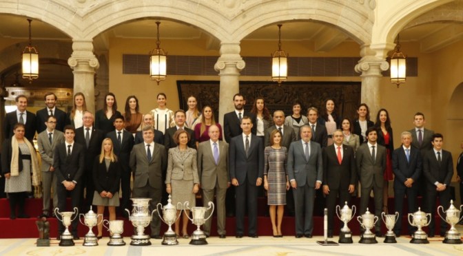 On Tuesday, November 17, 2015, Their Majesties King Felipe VI and Queen Letizia of Spain accompanied by TMs King Juan Carlos I and Queen Sofia of Spain attended the Premios Nacionales del Deporte 2014 held at Palacio Real de El Pardo in Madrid.