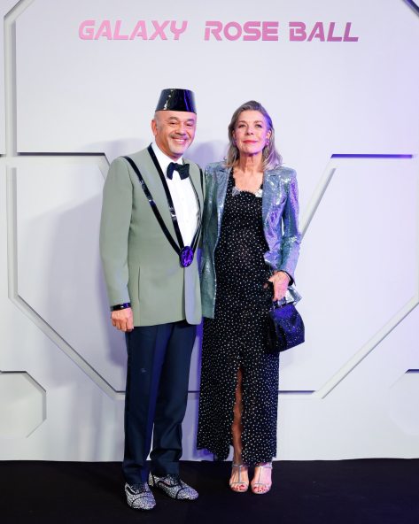 Last evening in the quartier of Larvotto, Her Royal Highness Princess Caroline of Hanover and Their Serene Highnesses Prince Albert II and Princess Charlene of Monaco attended the 70th edition of the Bal de la Rose inside the Salle des Étoiles at the Sporting Monte-Carlo.