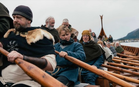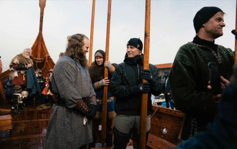 The reconstructed vessel, based on evidence from the 1874 excavation and subsequent research, was later launched onto the fjord. As part of the visit, the Crown Prince and the Prince joined members of a local rowing guild in rowing the vessel, participating in a demonstration of traditional seafaring practices associated with Viking-age vessels.