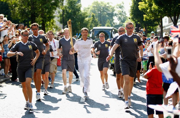 LONDON, ENGLAND – JULY 26: Frederik, Crown Prince of Denmark, carrries the Olympic Torch through Central London on July 26, 2012 in London, England. (Photo by Tom Shaw/Getty Images)