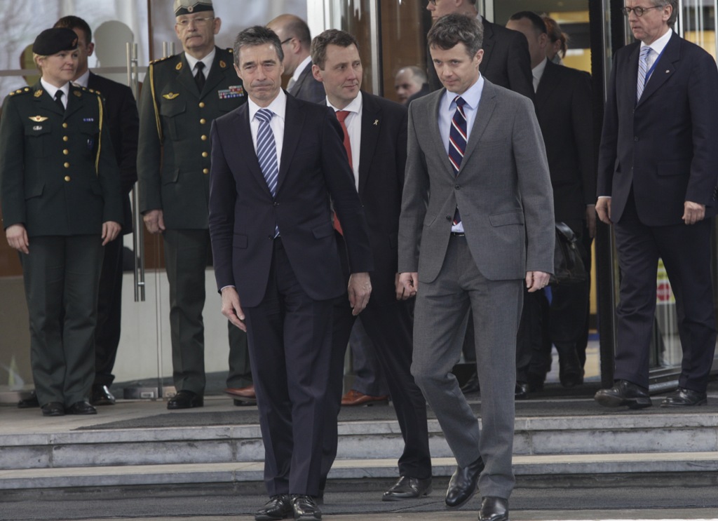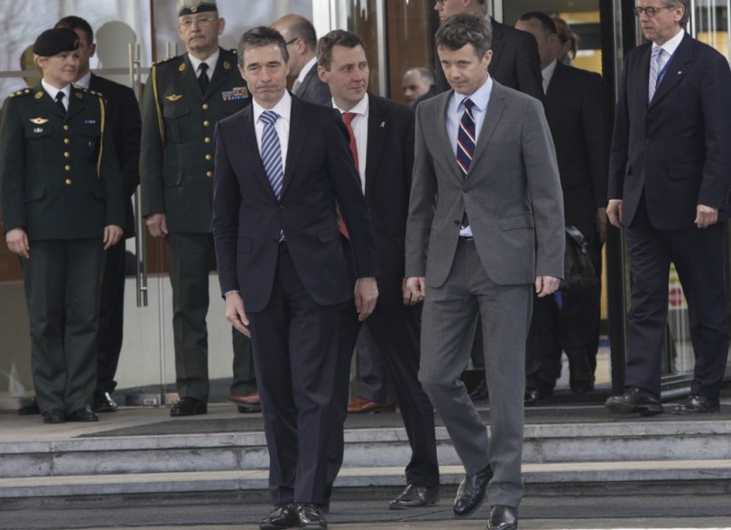 Denmark’s Crown Prince Frederik, center right, walks with NATO Secretary General Anders Fogh Rasmussen, center left, prior to laying a wreath in memory of the fallen at NATO headquarters in Brussels on Thursday, March 8, 2012. (AP Photo/Virginia Mayo)