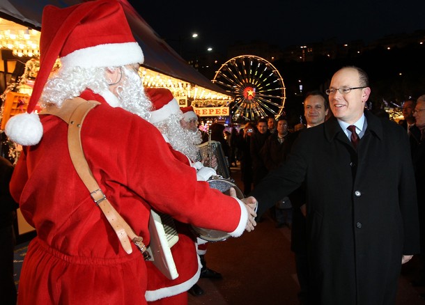 Prince’s Albert II of Monaco shakes hands with a man dressed like Santa Claus during the opening of the annual Christmas market in Monaco, on December 2, 2010. AFP PHOTO / VALERY HACHE (Photo credit should read VALERY HACHE/AFP/Getty Images)